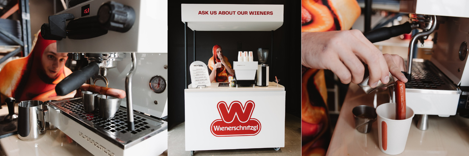 Perfect. That was exactly the reaction we were going for. This year, Nightowl Coffee—known for DFW coffee catering, espresso catering, and high-energy mobile barista stations—“announced” we’d been acquired by Wienerschnitzel.